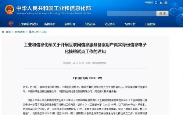 為切實減輕企業負擔,進一步提升互聯網信息服務備案主體真實身份信息準確率,實現“數據多跑路,群眾少跑腿”,工信部于4月1日-12月31日開展(ICP)備案主體真實身份信息電子化核驗試點工作。